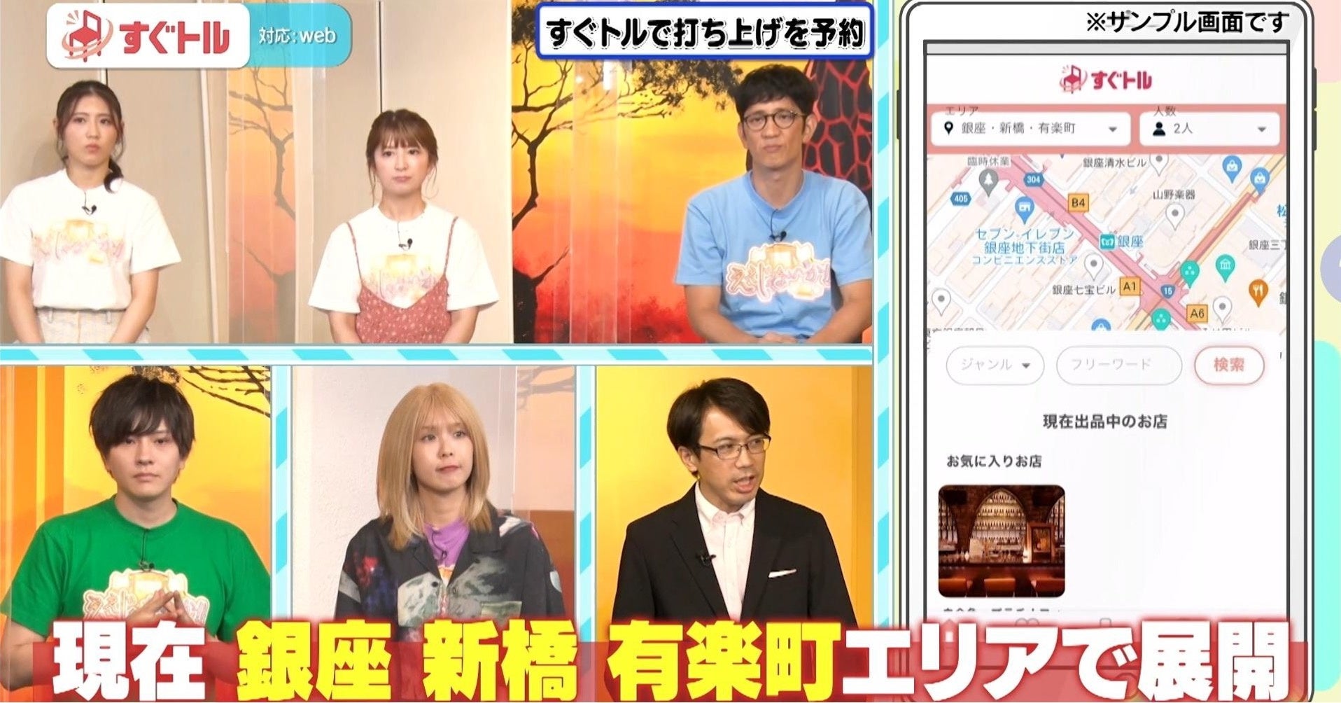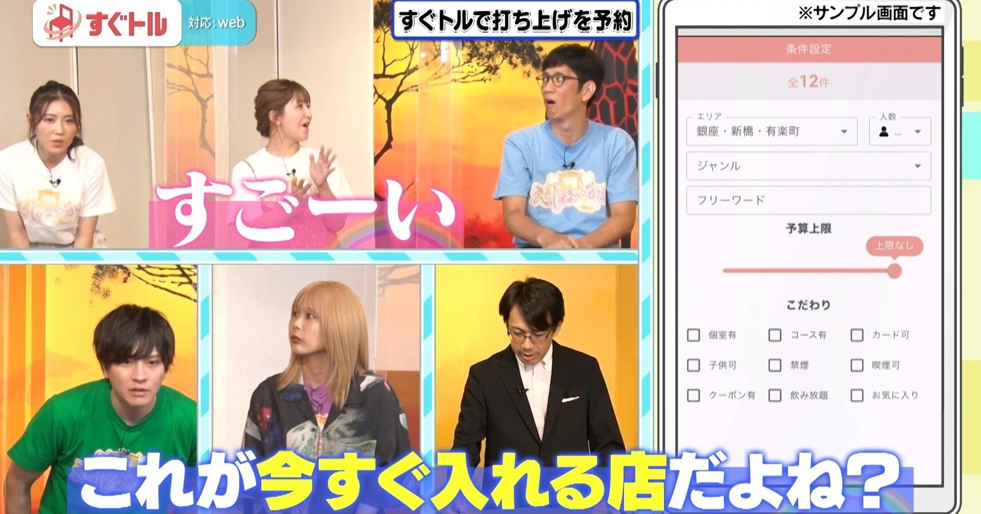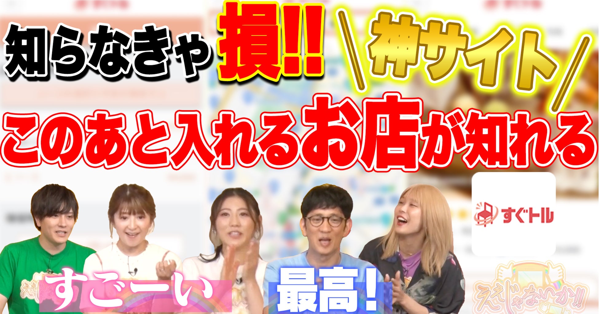 株式会社シートマーケット(本社:埼玉県和光市、代表取締役:鶴田陽平)が提供・運営する、飲食店向けの当日空席予約サイト「すぐトル」が、2022年8月28日(日)に東京MXテレビ『ええじゃないか!!』で紹介され、矢口真里さん、アンタッチャブル柴田さんなどスタジオの皆様より“神サイト”と大変ご好評いただきました!