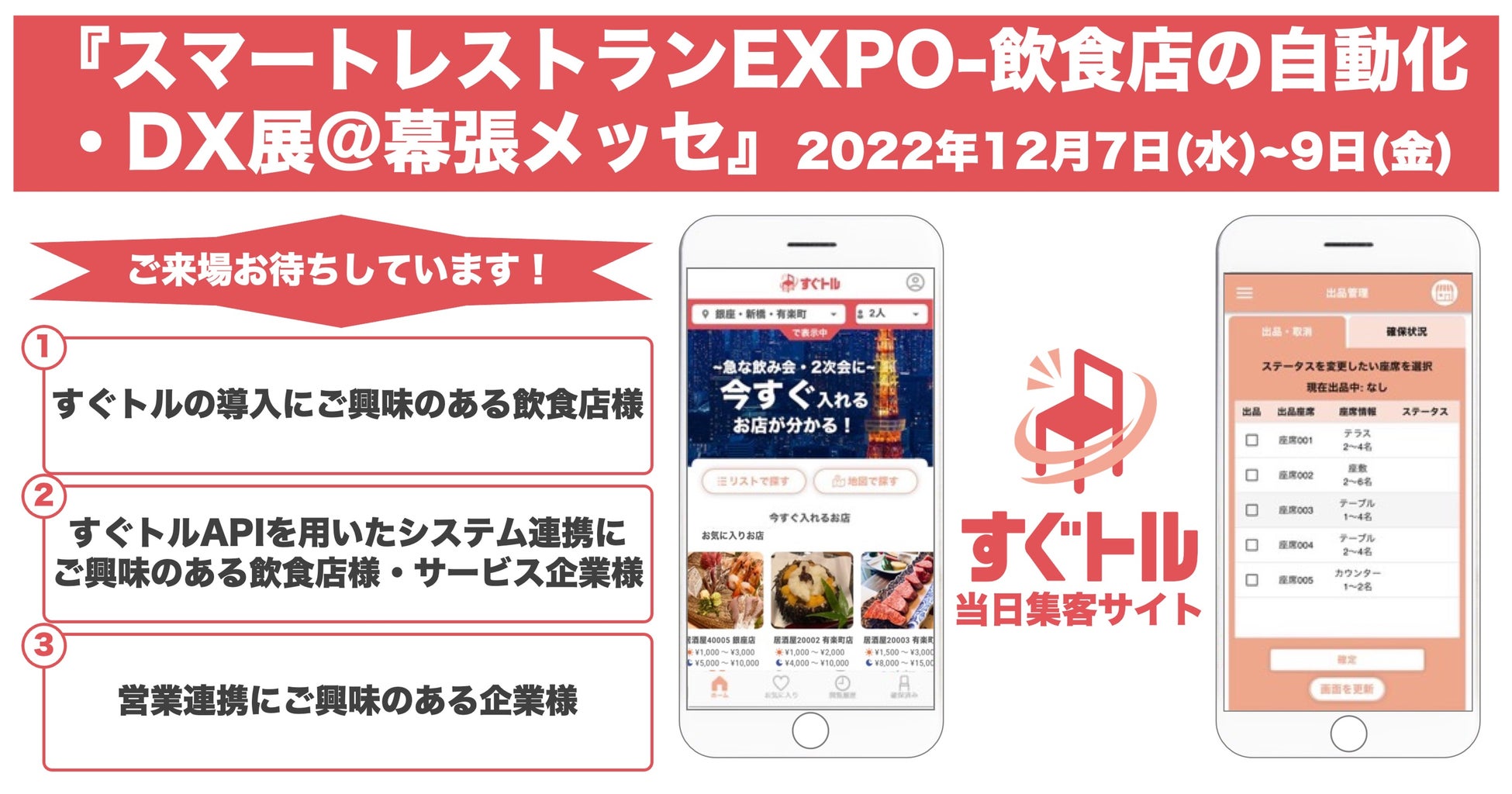 飲食店向けの当日集客サイト「すぐトル」を、2022年12月7(水)〜9日(金)に幕張メッセで開催される『スマートレストランEXPO-飲食店の自動化・DX展』に出展いたします。実際のサービス画面に触れながら「すぐトル」をご理解いただける絶好の機会となりますので、ぜひ当社ブースにお立ち寄りください。社員一同皆さまを心よりお待ちしております。